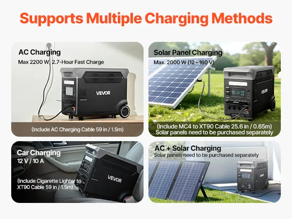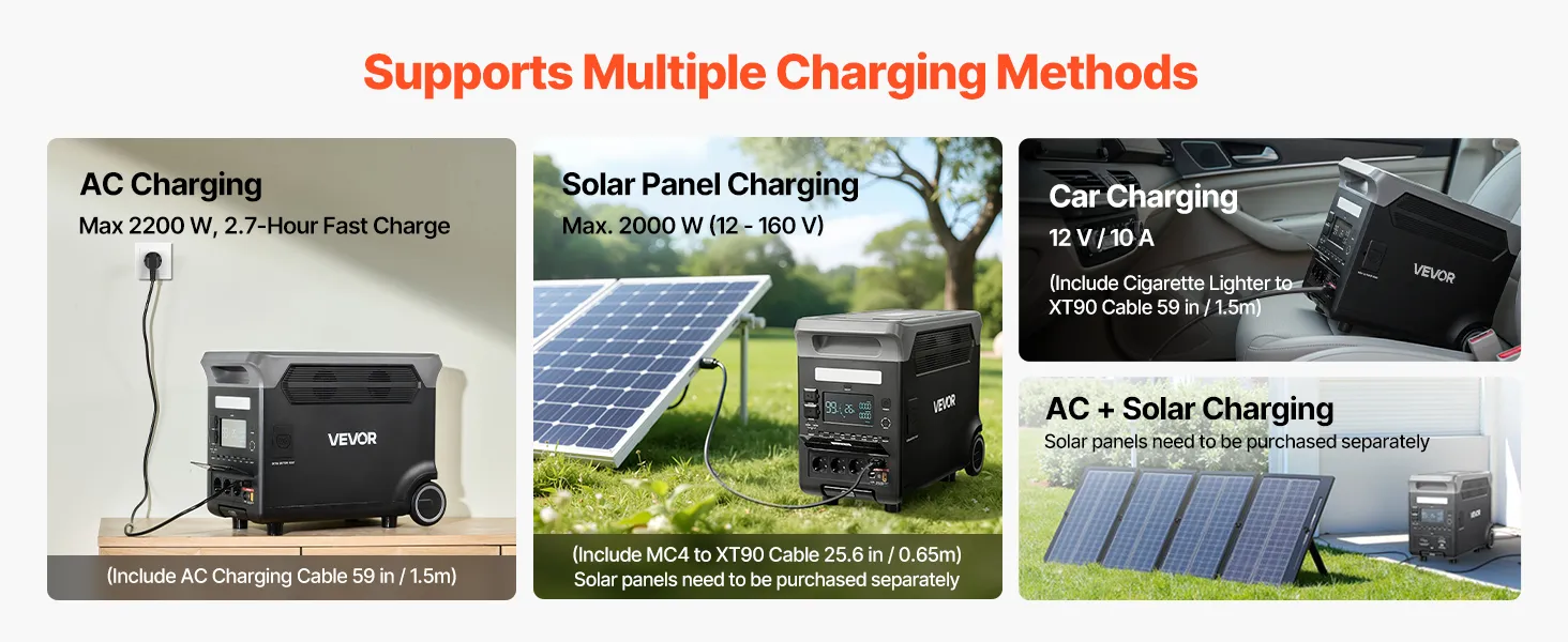 Opciones de carga versátiles: Cargue su estación de energía de tres maneras convenientes: con alimentación de CA, cargador de auto o panel solar(se vende por separado). Ya sea en casa, de viaje o al aire libre, nuestra batería de respaldo expandible LiFePO4 garantiza un suministro de energía eficiente