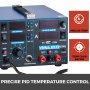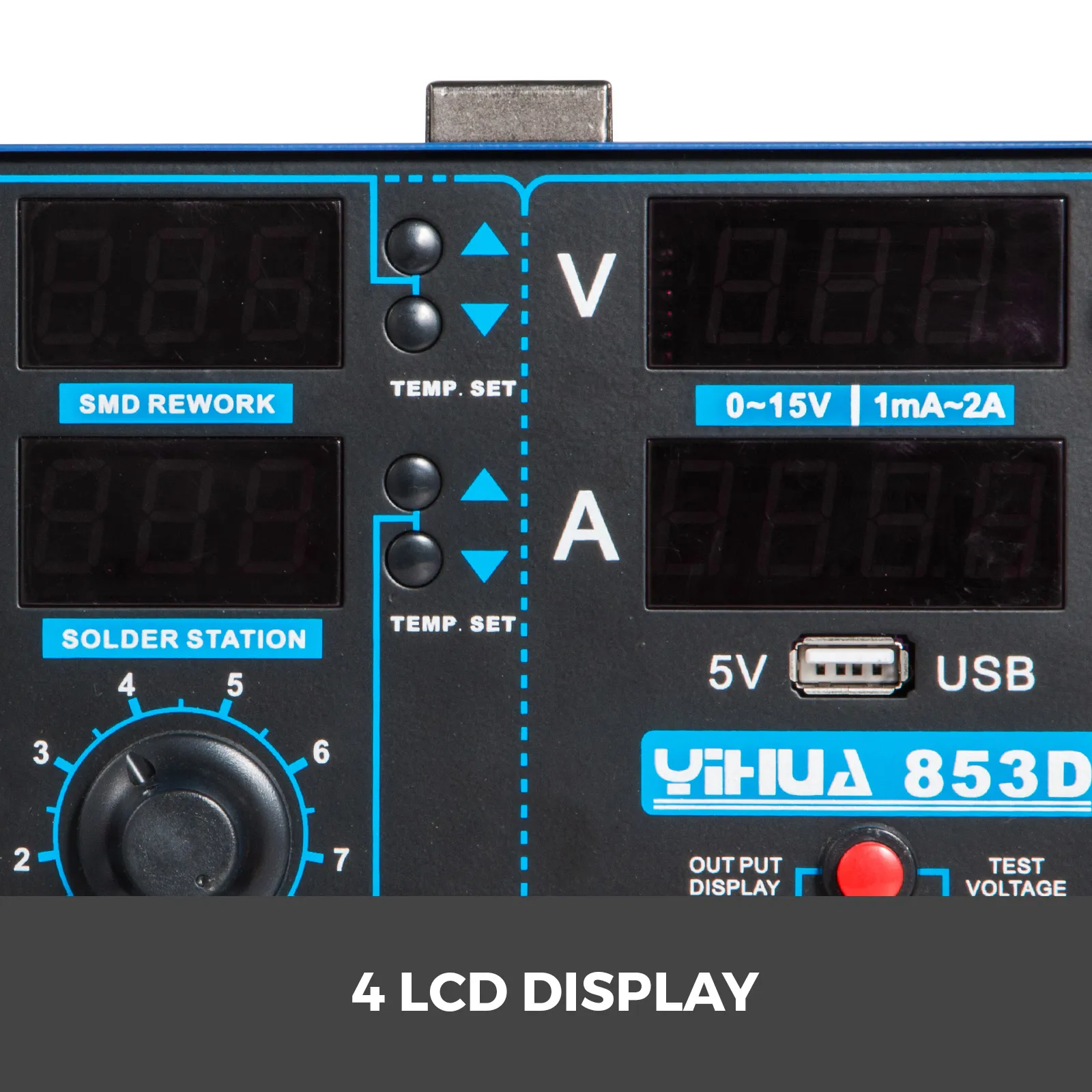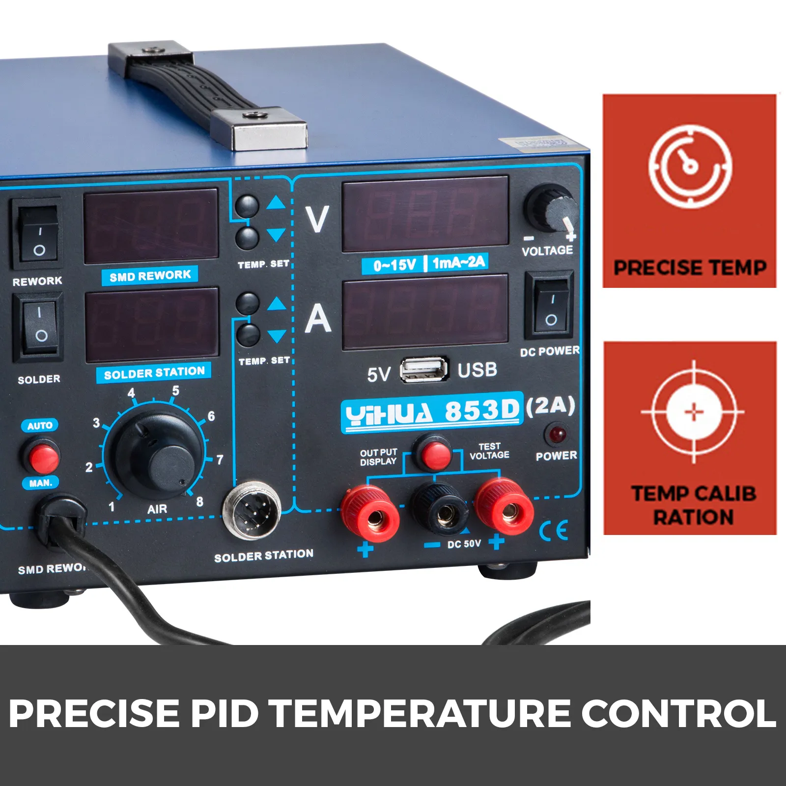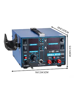 La estación de soldadura 853D-USB está diseñada para desoldar sin plomo. Utiliza la más reciente tecnología de control de programas PID de procesador de microordenador para calcular con precisión y producir la temperatura adecuada para la salida de la pistola de aire. El ajuste rápido de la temperatura y la salida de aire constante son la mejor opción para las necesidades de su estación de trabajo de calefacción.