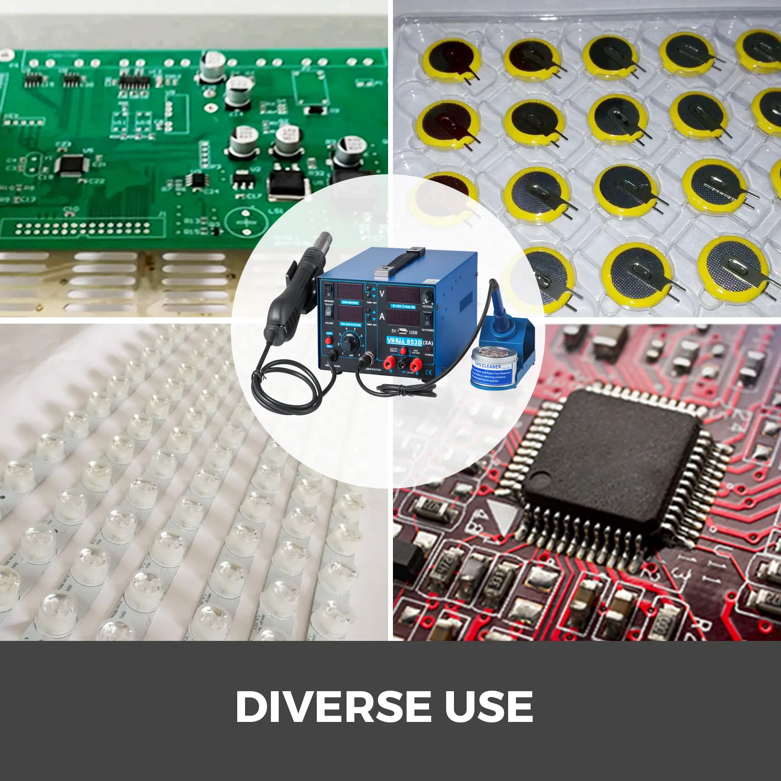 Diseñado para desoldar SOIC, CHIP, QFP, PLCC, BGA y otros componentes sensibles a la temperatura, es una herramienta esencial para la reparación de teléfonos celulares, reparación de computadoras portátiles o soldadura de placas de circuitos.