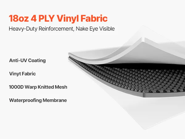 Tela de PVC engrosada de 18 oz: Nuestra tela para toldo está hecha de 4 capas de material de vinilo resistente, mejorado a 1000D de alta densidad, 510 g/㎡ de peso para mayor durabilidad. Las costuras bien cosidas y el acabado de los bordes son resistentes al desgarro y al deshilachado, lo que garantiza un uso duradero