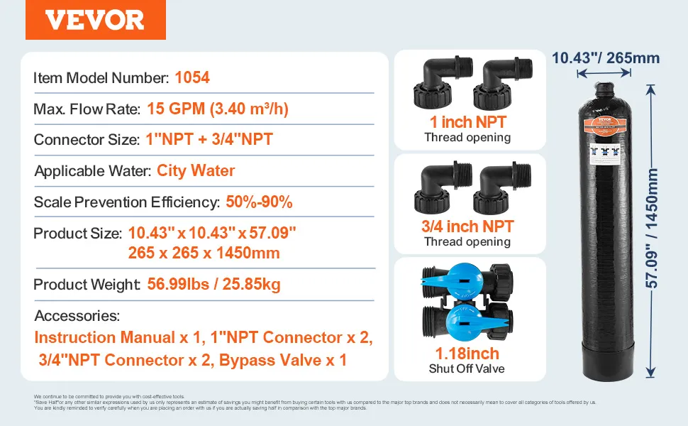 Fácil de instalar: Instálelo en la entrada de la línea principal de agua para proteger eficazmente todos sus equipos de agua. El alto caudal de 15 GPM es compatible con la mayoría de las tuberías estándar.