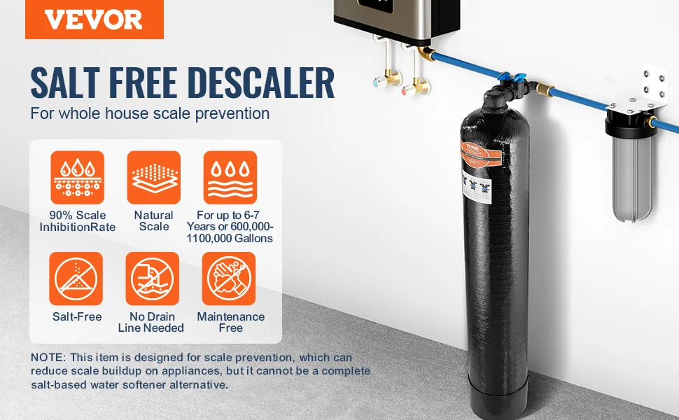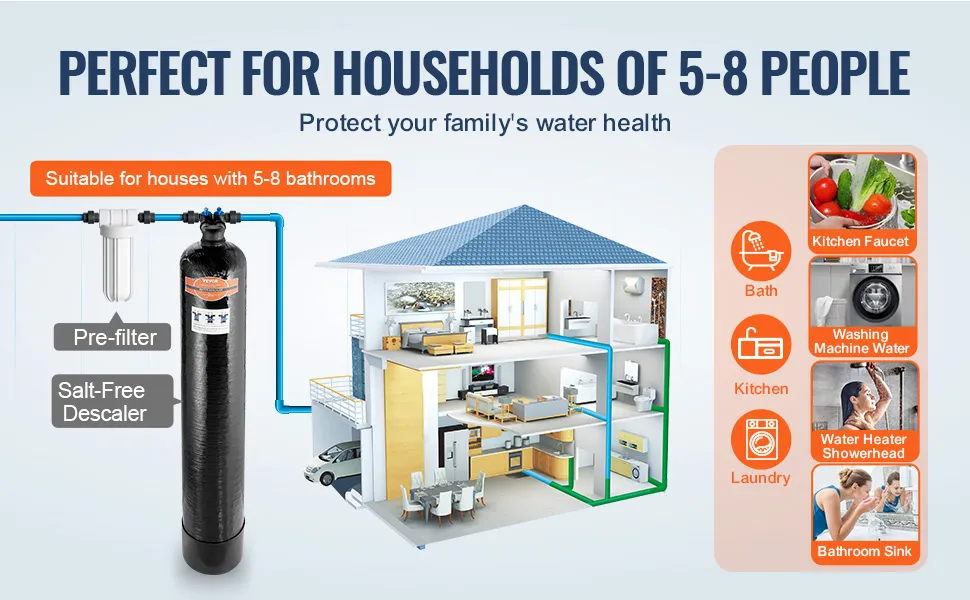 Este descalcificador sin sal de gran tamaño es versátil y satisface fácilmente las necesidades de agua de hogares de 5 a 8 personas. Ya sea para grifos, calentadores de agua, lavadoras, purificadores de agua, lavavajillas o tuberías de calefacción.