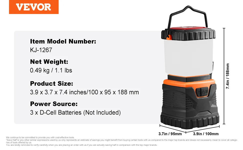 Funciona con pilas para un uso prolongado: luminosidad de 1000 lúmenes, funciona con 3 pilas tipo D (no incluidas). Pilas fáciles de sustituir gracias a una tapa desmontable. Diseñada para soportar el clima lluvioso y las condiciones más duras. No vuelvas a tener que buscar luces tenues: mantente iluminada y preparada para cualquier aventura con nuestra linterna para acampar.