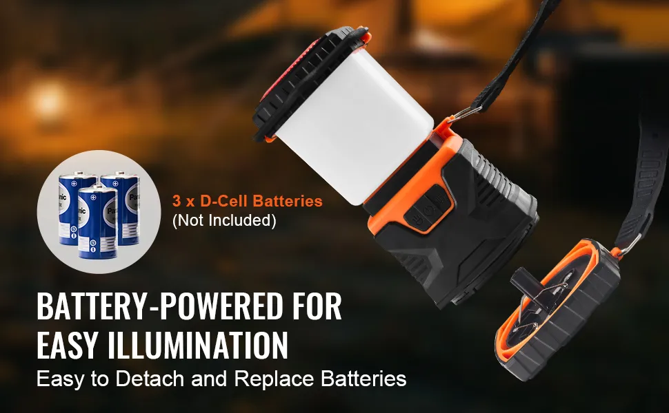 Nuestra linterna para acampar utiliza 3 pilas tipo D (no incluidas). Es fácil de desmontar y reemplazar las pilas cuando sea necesario. Las reparaciones sencillas significan menos problemas y más diversión para sus viajes al aire libre.