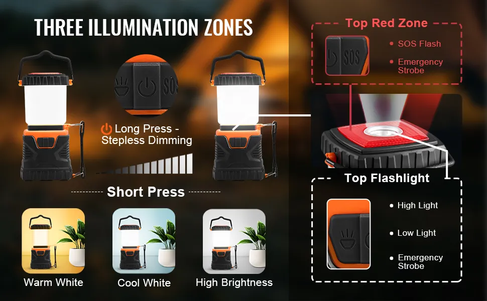 4 modos de luz y control de brillo: cambia entre blanco frío, blanco cálido, blanco combinado y modos intermitentes. Ajusta el brillo suavemente manteniendo presionado el botón. Encuentra la luz adecuada para cada momento, asegurándote de que siempre estés en el estado de ánimo o la situación adecuados con nuestra versátil luz para acampar.