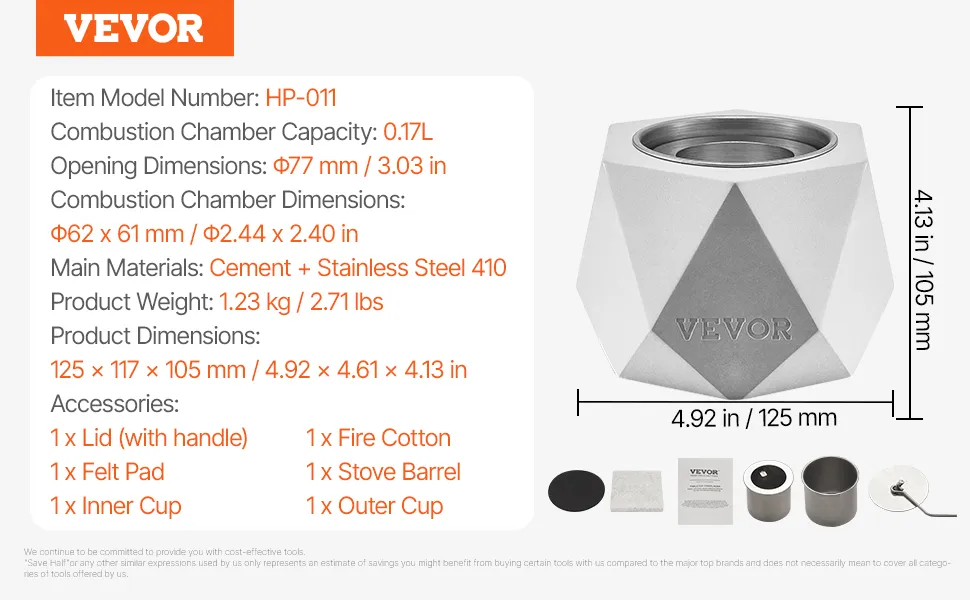 Compacto y liviano: Este brasero de mesa mide 4,92 x 4,61 x 4,13 pulgadas(12,5 x 11,7 x 10,5 cm) y pesa solo 2,71 libras(1,23 kg), lo que lo hace fácil de transportar y perfecto para uso en exteriores