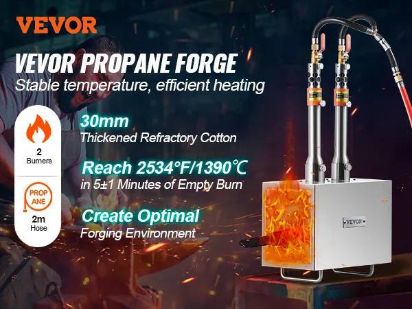 Efficient Heating & Stable Temperature: The 30 mm thick, fire-resistant cotton construction of the portable propane forge ensures efficient heat concentration and minimizes heat loss. Combined with two powerful burners, it generates strong and consistent heat, allowing the forge to quickly reach and maintain a stable temperature of up to 2600 °F (1427 °C). Its superior performance makes it easy to create high-quality metal tools or artwork.