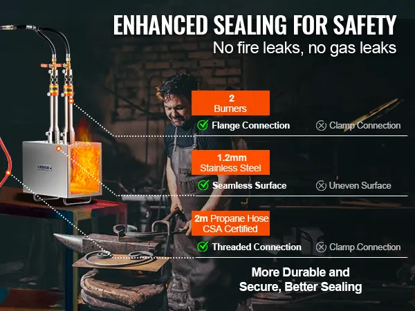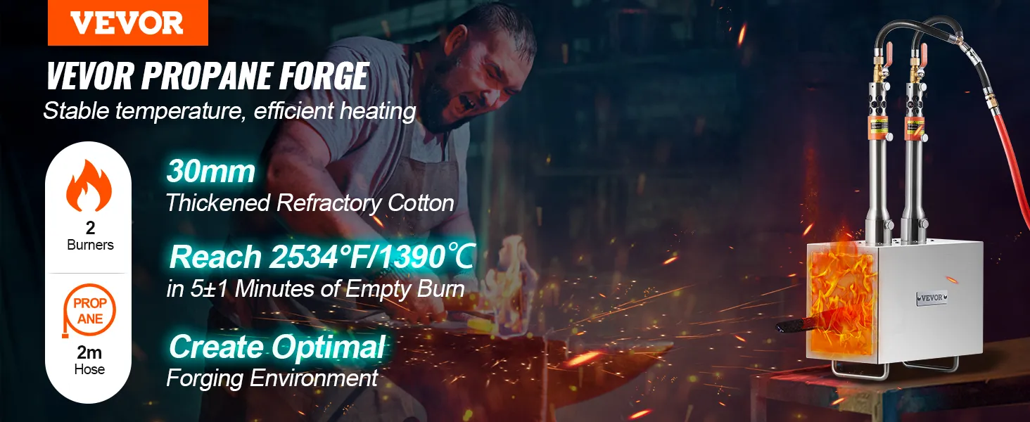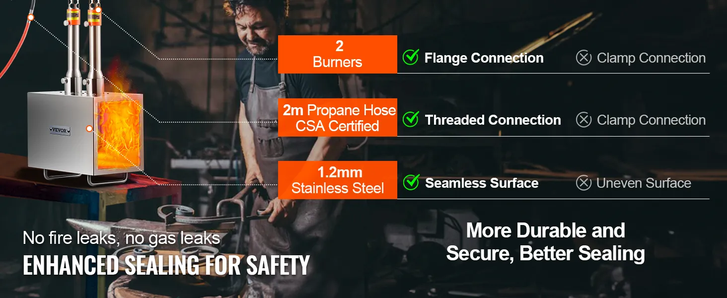 Improved workmanship & durability: The high-quality workmanship increases safety during production. This propane gas forge, made of corrosion-resistant 201 stainless steel, withstands high temperatures, flue gases, and chemical corrosion, thus ensuring a long service life.