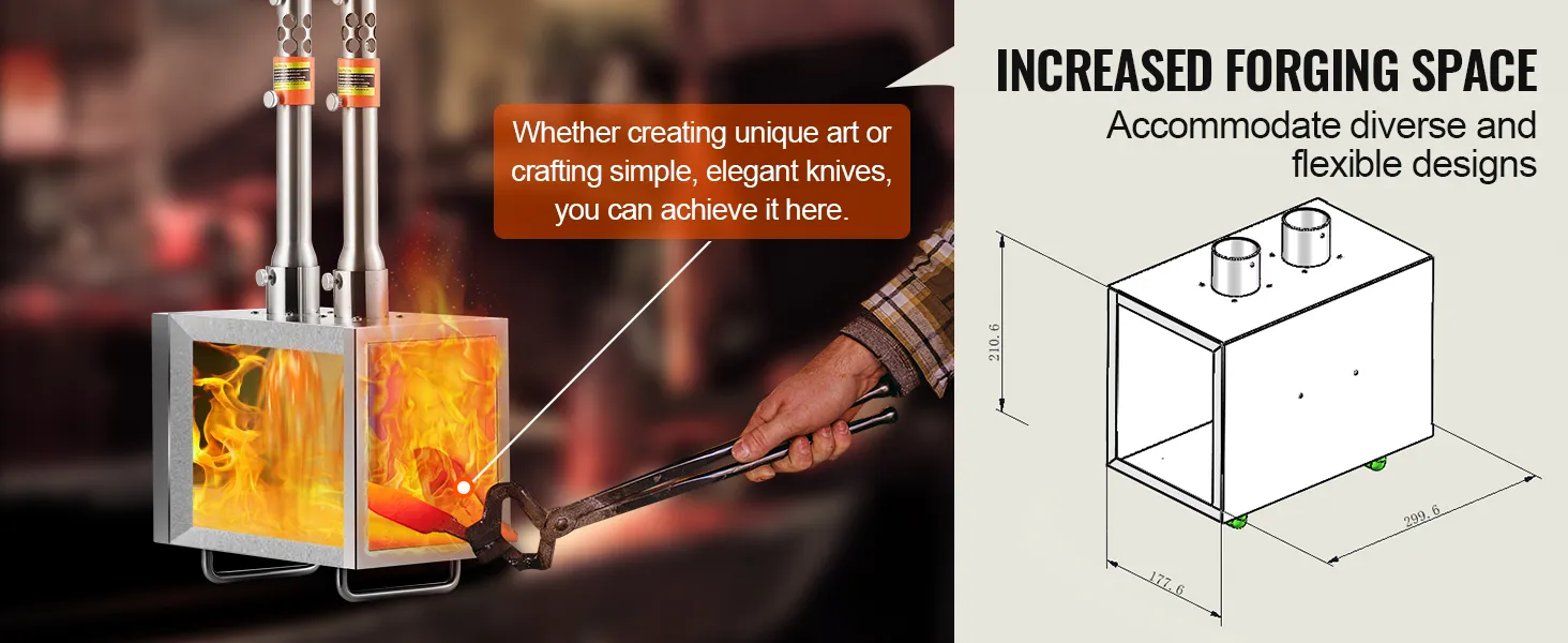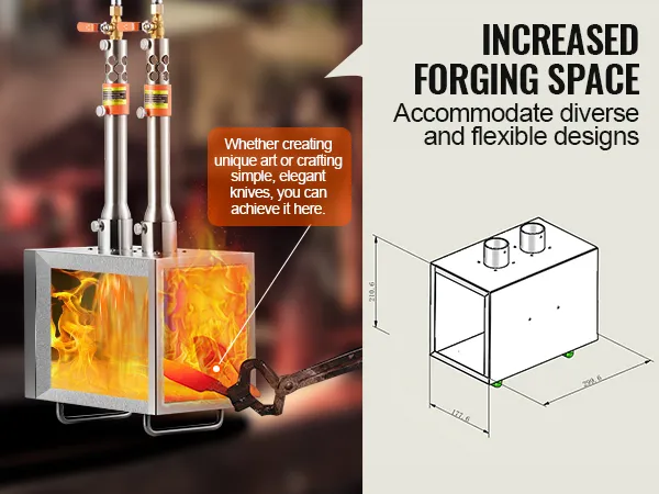 More space & flexible loading: The forge has a square design, creating a larger and more spacious interior that accommodates metal stocks of varying sizes and shapes. This design supports diverse forging needs, whether for knives, nails, bracelets, screws, or scissors. Furthermore, the scientifically designed interior improves heating efficiency.