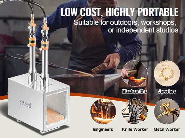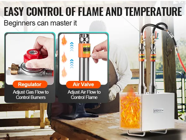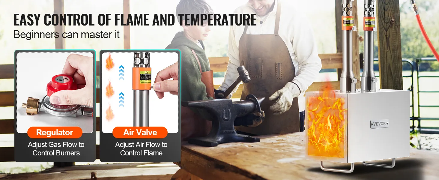 Easy Operation & Temperature Control: The gas forges for blacksmithing feature two burners with adjustable valves to control the use of one or two burners. The air valve adjusts the air-to-propane ratio, while the regulator controls the propane flow. These settings allow for precise firing and temperature control for various metals such as gold, copper, silver, stainless steel, steel, brass, bronze, magnesium, aluminum, alloys, lead, and tin.
