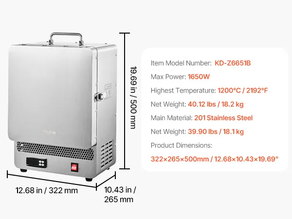 VEVOR Horno de Fusión Eléctrico 1650 W, Temperatura Máxima 1200 ℃, para Fundición a la Cera Perdida, Arcilla, Recocido de Metales, Vocción de Cerámica y Control de Temperatura, 535 x 405 x 345 mm