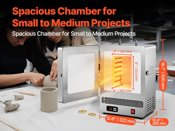 Diseño compacto: Este horno de fusión presenta un diseño compacto que cabe fácilmente en bancos de trabajo o mesas de garaje. Su cámara de 203 x 127 x 152 mm ofrece amplio espacio para la fundición diaria de metales, la fundición de joyas o la cocción casera, ofreciendo versatilidad sin ocupar demasiado espacio de trabajo