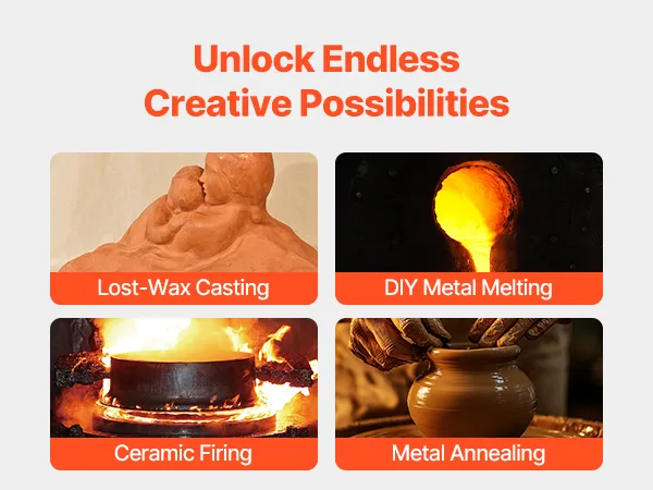 Aplicaciones versátiles: Este horno eléctrico de fusión es ideal para fundición a la cera perdida, fundición de metales, cocción de cerámica y proyectos de tratamiento térmico. Es ideal para estudios caseros o aficionados, y también es una herramienta bien diseñada para creativos y aficionados a las manualidades, compatible con una amplia gama de aplicaciones creativas