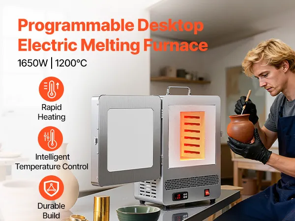 Con una potencia de 1650 W y una temperatura máxima de 1200 °C, este horno eléctrico de fusión es ideal para la fusión de metales, la fundición a la cera perdida, el recocido de metales y pequeños proyectos cerámicos.