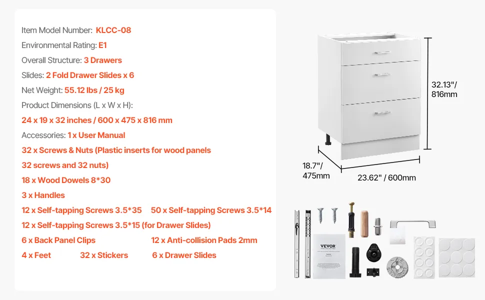 Madera de calidad: El gabinete listo para ensamblar tiene un tamaño de gabinete de 600 x 475 x 816 mm. La estructura principal está hecha de tableros de partículas de alta calidad, mientras que el cajón está hecho de MDF, lo que garantiza una durabilidad duradera. Todos los paneles expuestos están protegidos por protectores de esquinas y empaquetados cuidadosamente para proteger la superficie de rayones