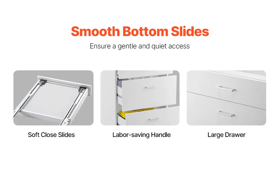 ¿Cansado de los portazos en los cajones? Este gabinete cuenta con correderas de cierre suave que garantizan que el cajón se cierre de manera suave y silenciosa, eliminando el ruido y el impacto de los mecanismos de cierre tradicionales.