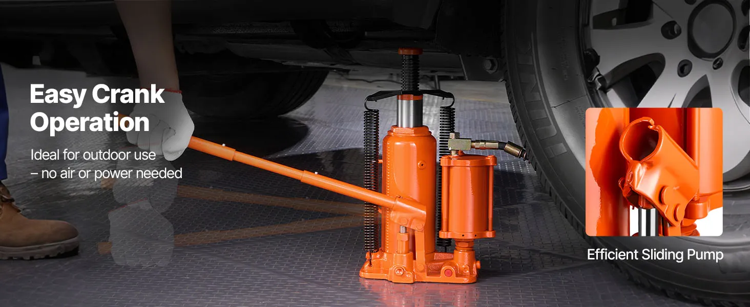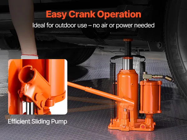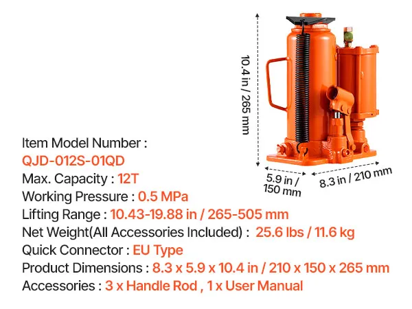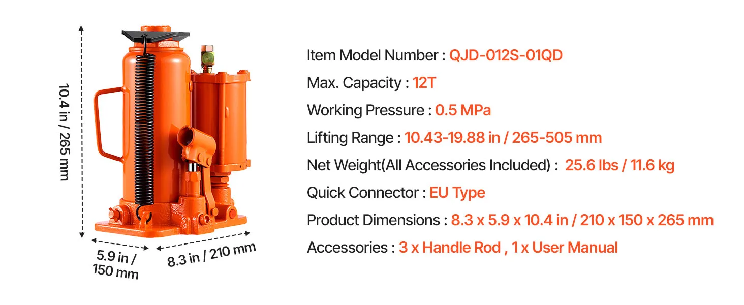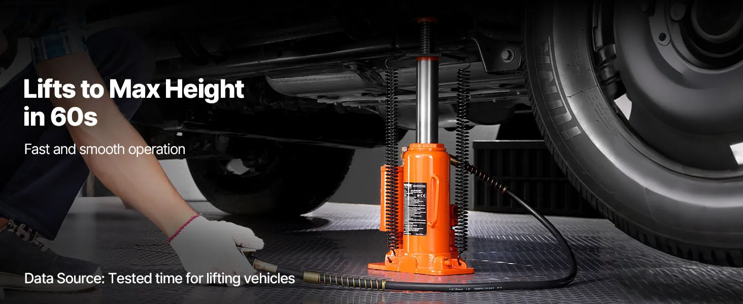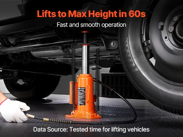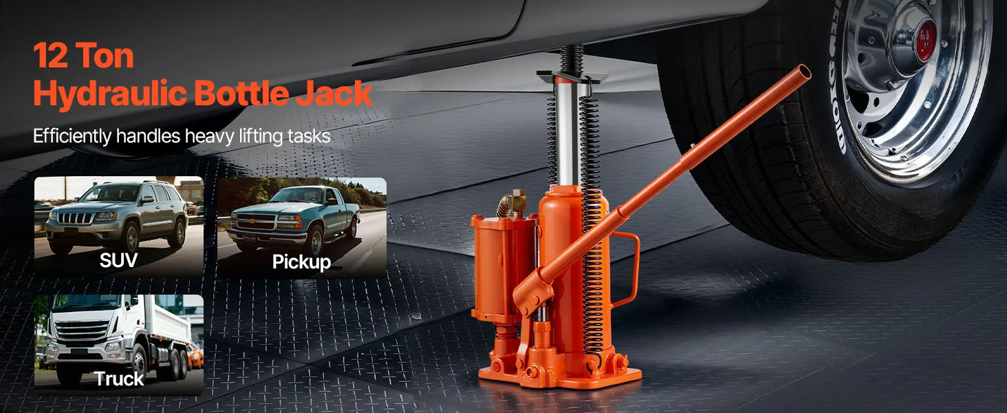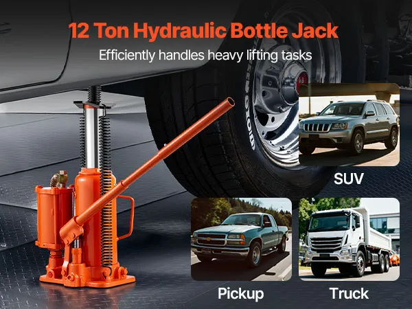 Elevación de cargas pesadas: Con una capacidad de elevación de hasta 12 T, este gato hidráulico de botella maneja con facilidad SUV, camiones y camionetas, ideal para cambios de neumáticos e inspecciones rápidas
