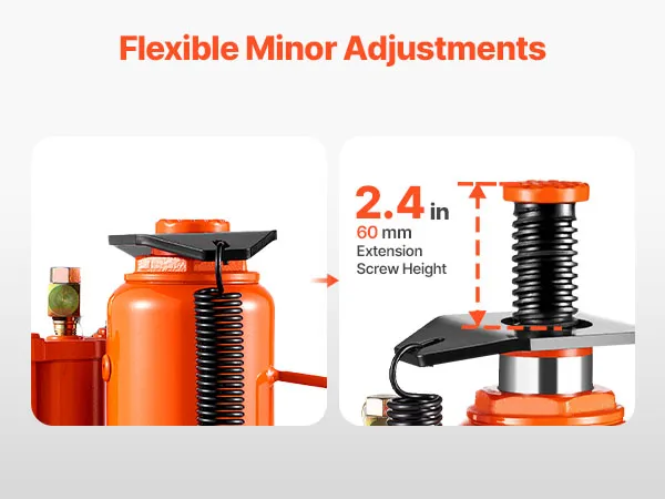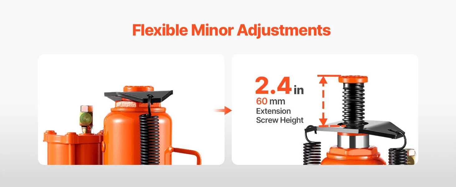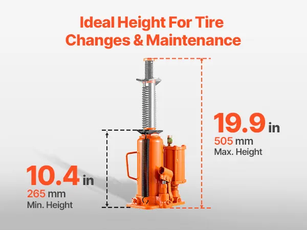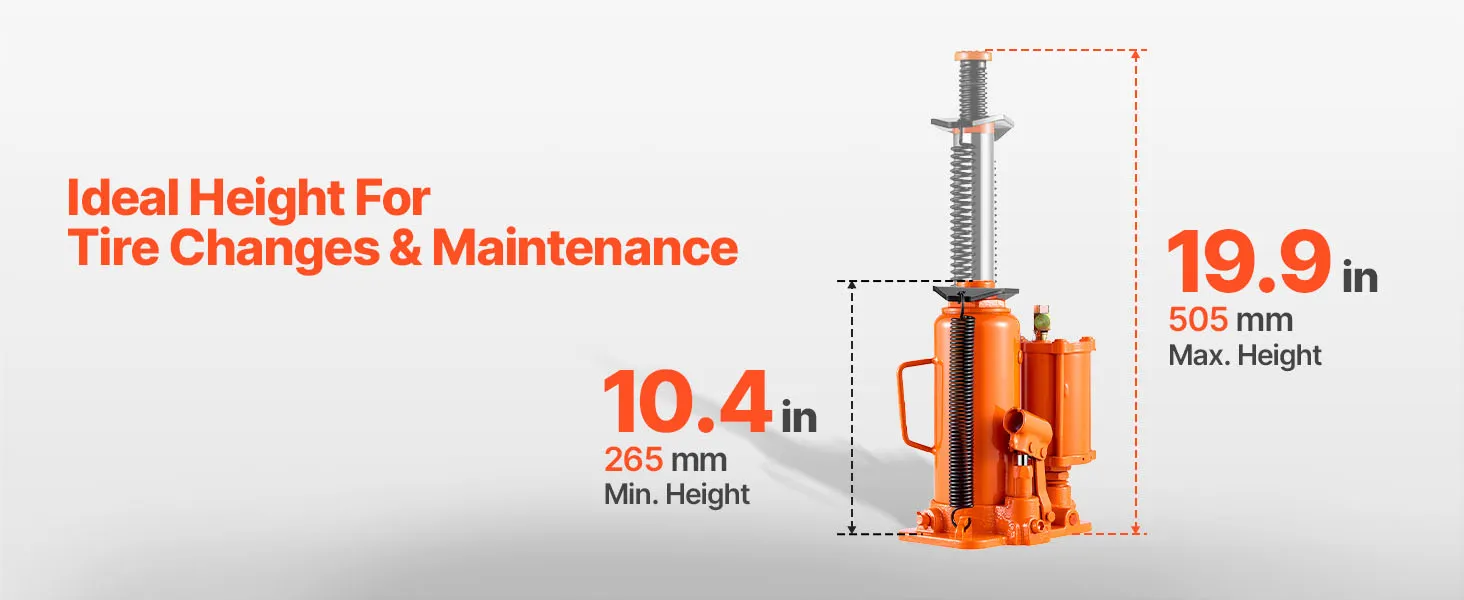 Amplio rango de elevación: Desde baja hasta alta altura, este pequeño gato hidráulico ofrece un amplio rango. Eleva desde 265 mm hasta 505 mm, con un tornillo de 60 mm para un ajuste preciso de la altura, muy útil en espacios reducidos