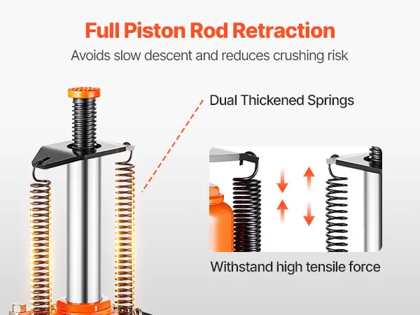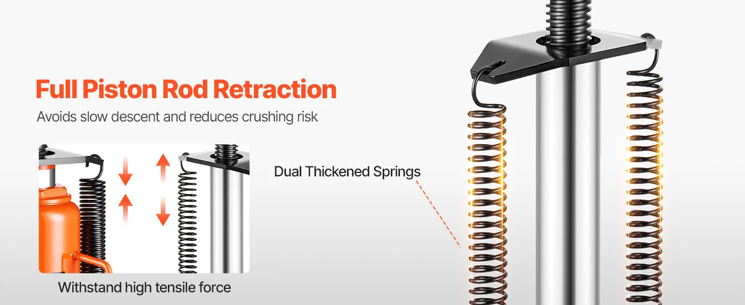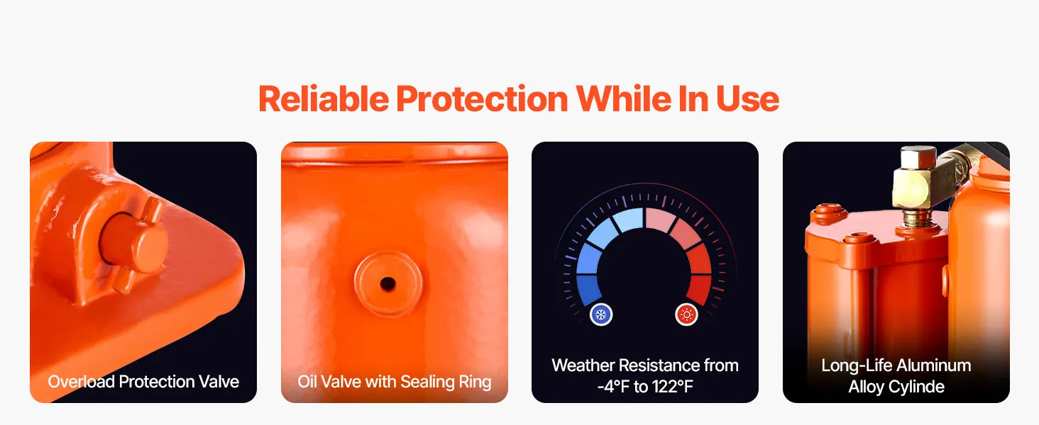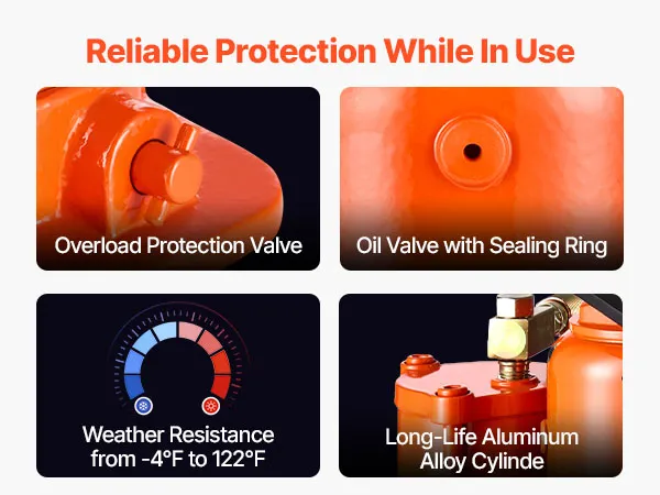 Diseño de protección: El cilindro de aleación de aluminio del gato hidráulico sella herméticamente para un rendimiento duradero. Una válvula integrada ayuda a evitar sobrecargas y el puerto de llenado de aceite permanece sin fugas. Los resortes dobles reinician el pistón rápidamente, para que esté listo para el próximo trabajo