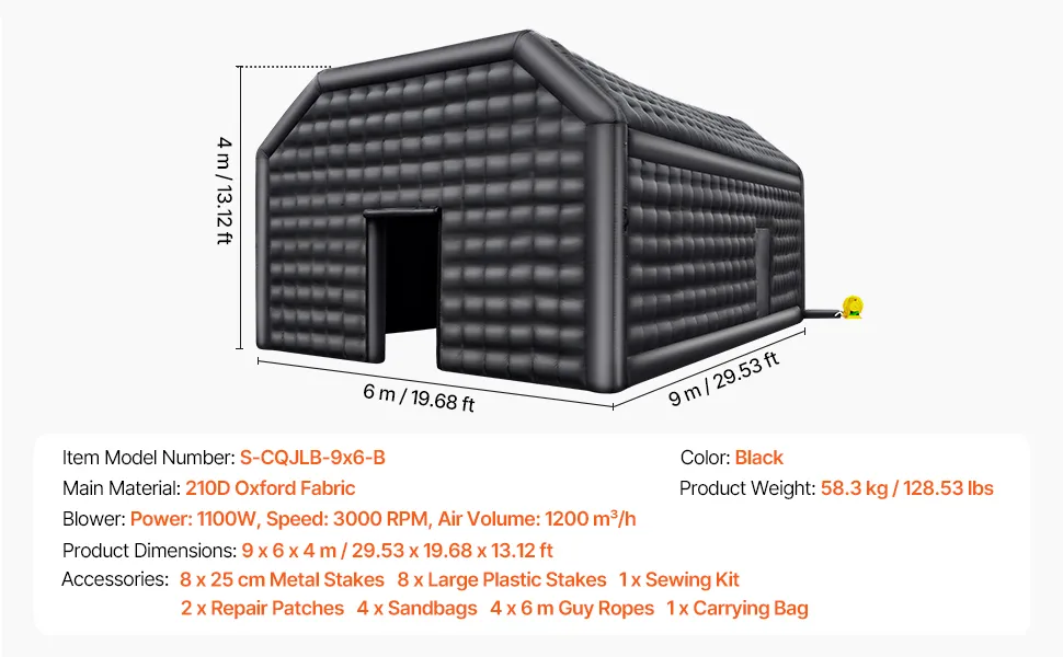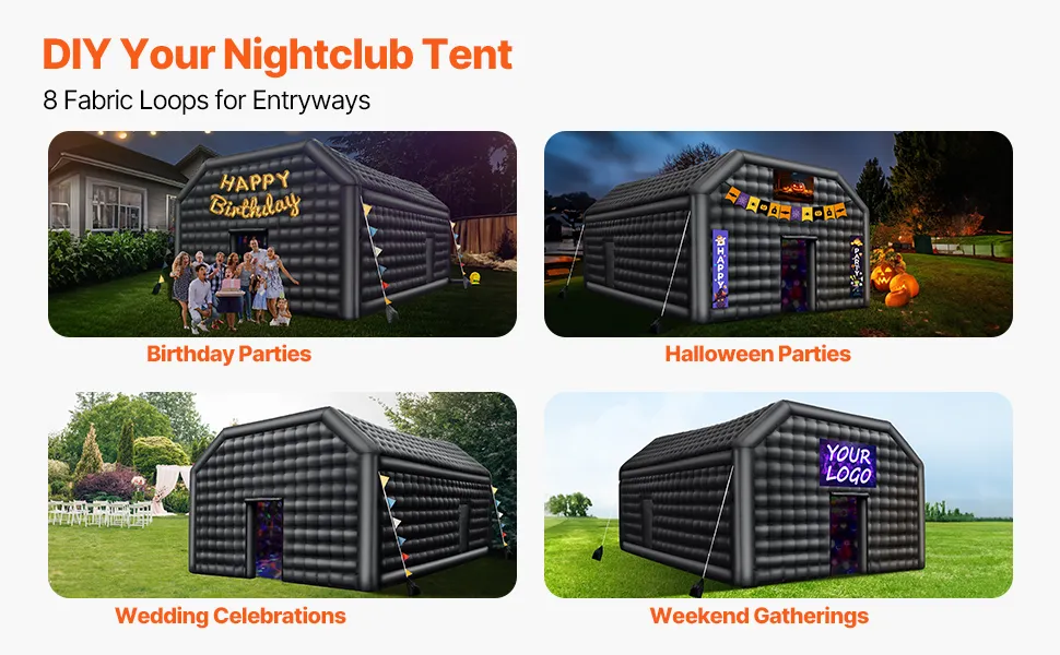 Esta carpa inflable para discoteca de 581 pies cuadrados ofrece un amplio espacio para eventos animados como bodas, fiestas, cumpleaños y Halloween. Con una instalación rápida, un diseño estable y una tela Oxford duradera, es su socio confiable para cualquier ocasión.