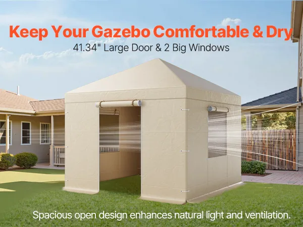 Una puerta espaciosa de 41,34 pulgadas/1050 mm y dos ventanas grandes de 3,44 x 3,44 pies (1,05 x 1,05 m) cuentan con paneles de malla enrollables para proporcionar circulación de aire, luz natural brillante y un interior seco y cómodo.