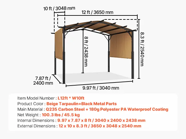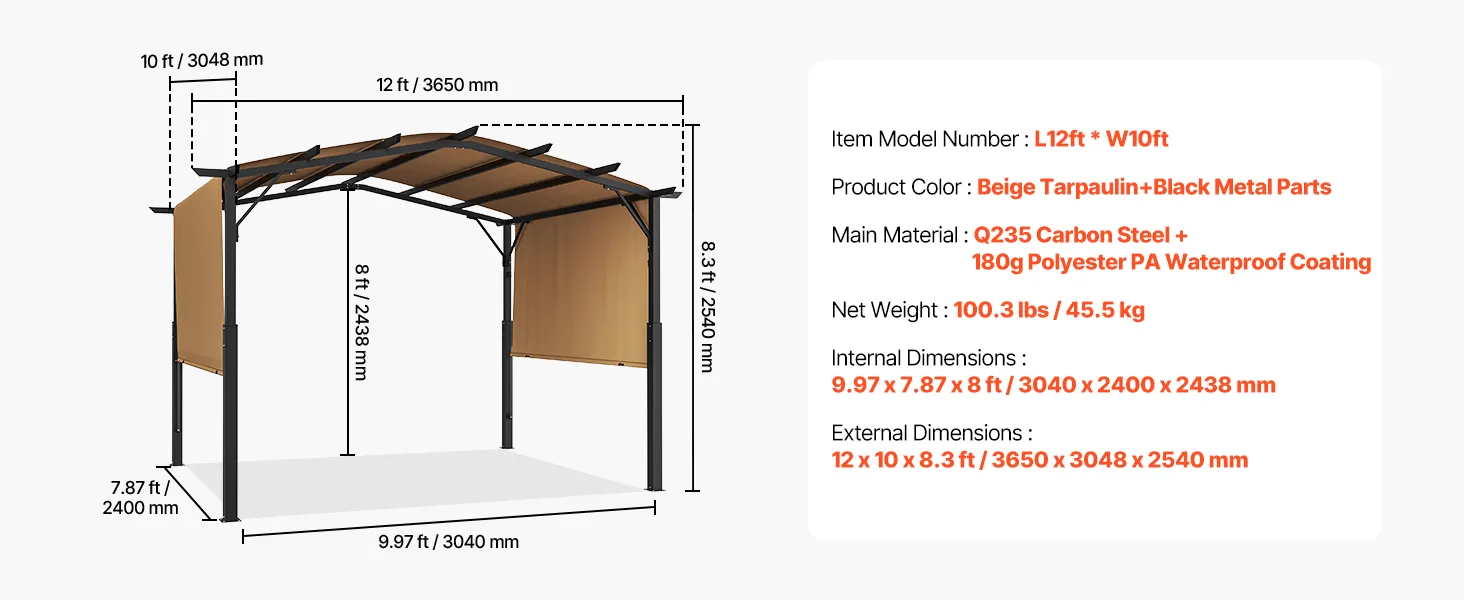 Nuestra pérgola arqueada de 10 x 12 pies cuenta con un marco de acero al carbono y una tela impermeable de poliéster PA para mayor durabilidad. Los lados del dosel cuentan con clips de sujeción y bolsas de arena para evitar la acumulación de agua y proteger las varillas superiores.