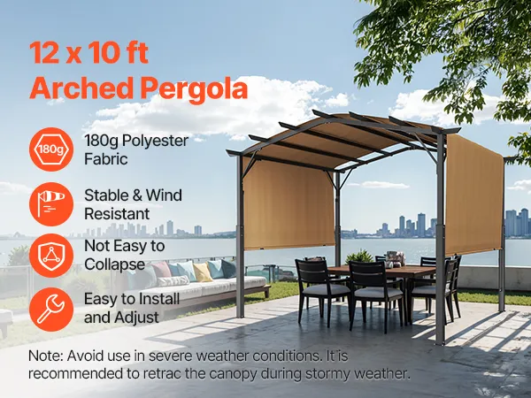 Aspecto elegante: Nuestra pérgola para exteriores de 12 x 10 pies ofrece 120 pies cuadrados de área sombreada, ideal para combinar con mesas y sillas (NO incluidas). El práctico riel deslizante le permite ajustar fácilmente el toldo en ambos lados, lo que ofrece una forma personalizable y flexible de crear su zona de sombra ideal con un toque personal