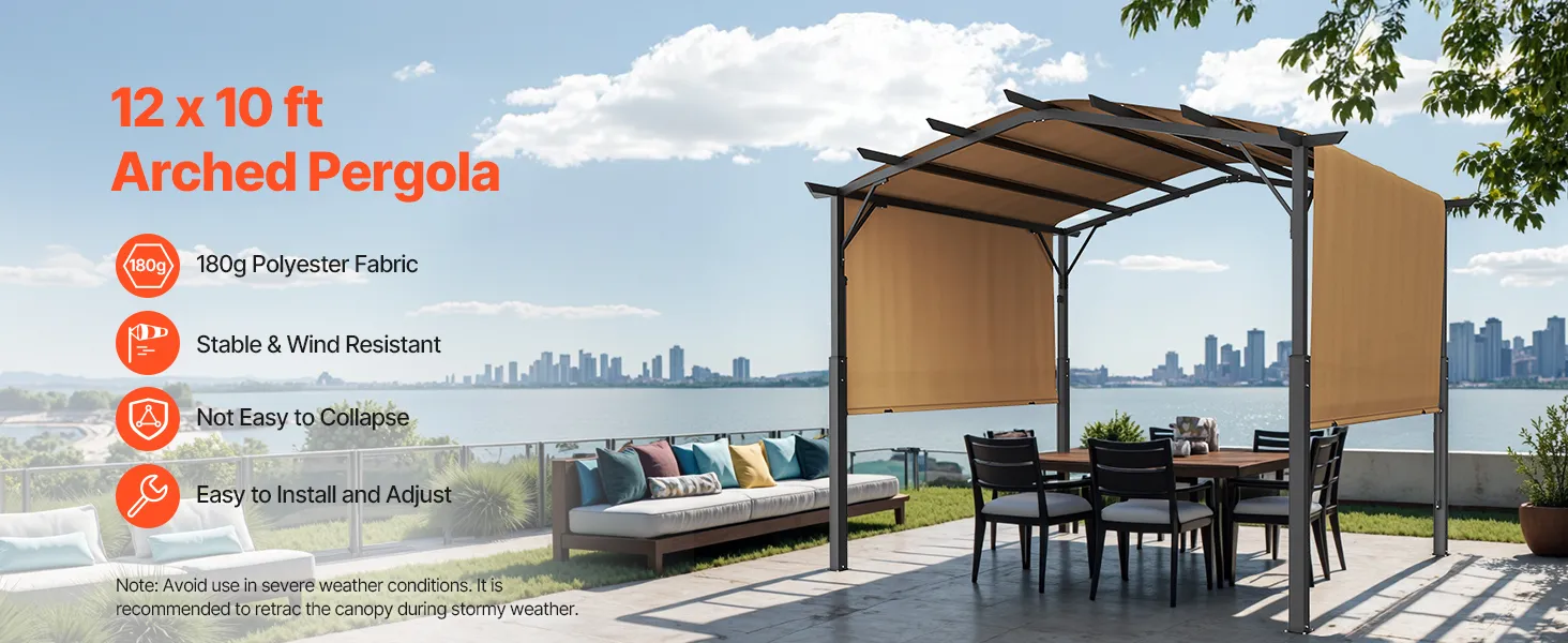 VEVOR Pérgola retráctil Exterior, 3650 x 3048 x 2540 mm Pérgola de Metal con Parte Superior Arqueada, Toldo Parasol, Gran Pabellón de Refugio para Patio, Terraza, Patio Trasero, Porche y Piscina