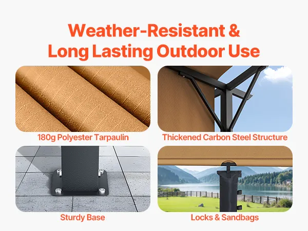 Tejido de poliéster duradero: El toldo para patio está hecho de tejido impermeable de poliéster PA de 180 g, que ofrece una gran resistencia a la tracción y una excelente protección solar. Está diseñado para un uso prolongado, es resistente a desgarros y proporciona un refugio cómodo. (Nota: en caso de lluvia intensa, baje un lado del toldo hasta el punto más bajo, asegúrelo con los clips de sujeción y use bolsas de arena para evitar la acumulación de agua en la parte superior)
