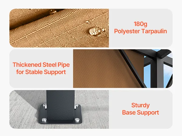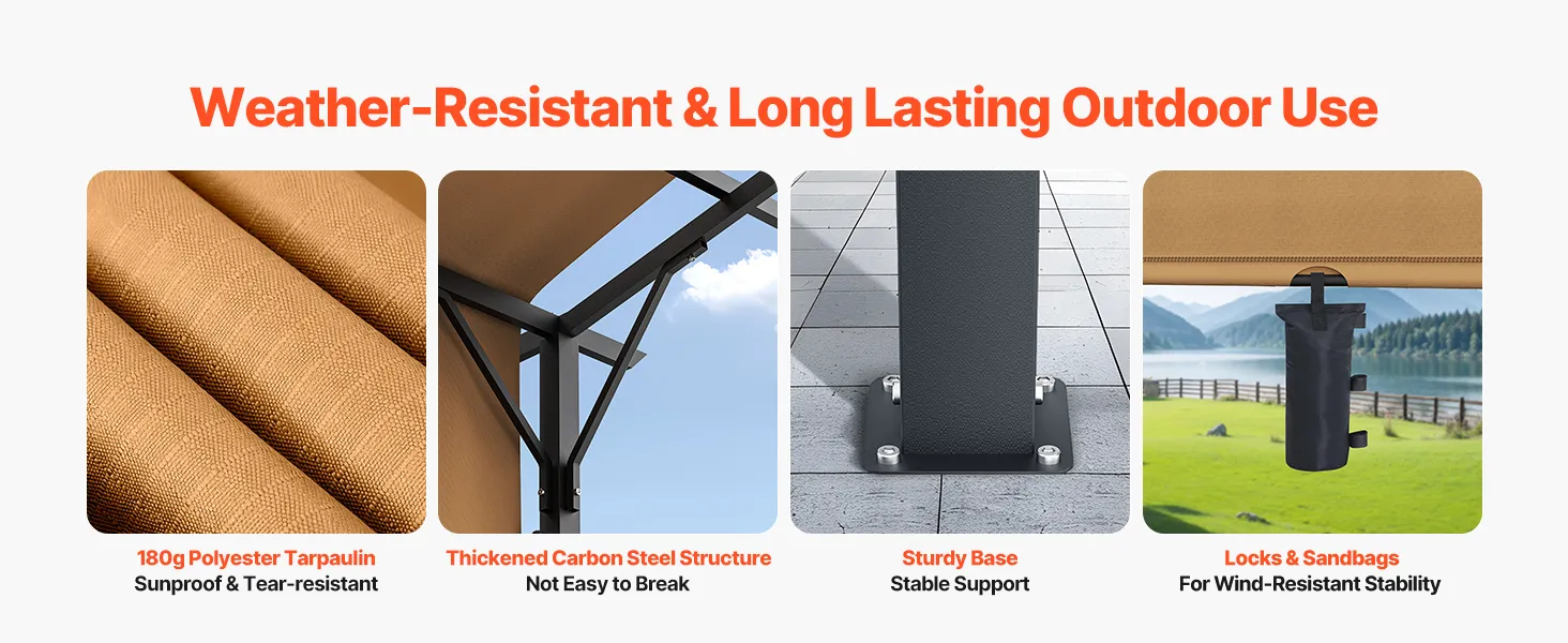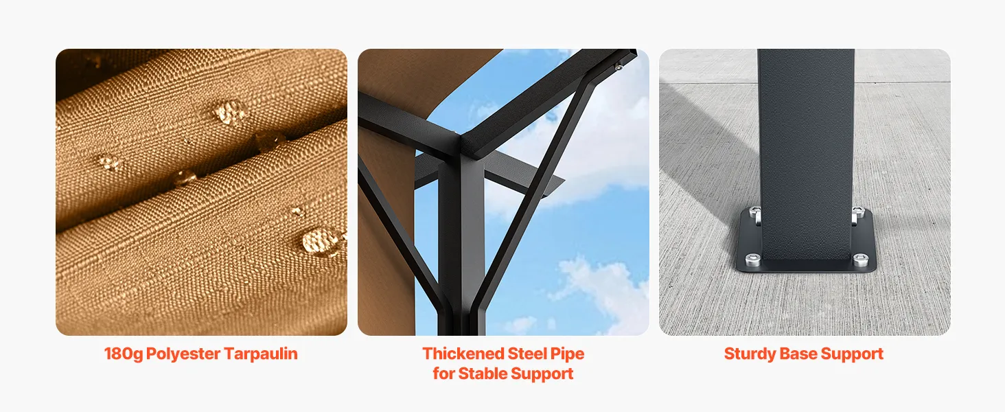 Construida con tubos de acero engrosados para un marco estable y sólido, esta pérgola para exteriores está combinada con un dosel de poliéster duradero de 180 g, lo que la hace ideal para un uso duradero en exteriores.