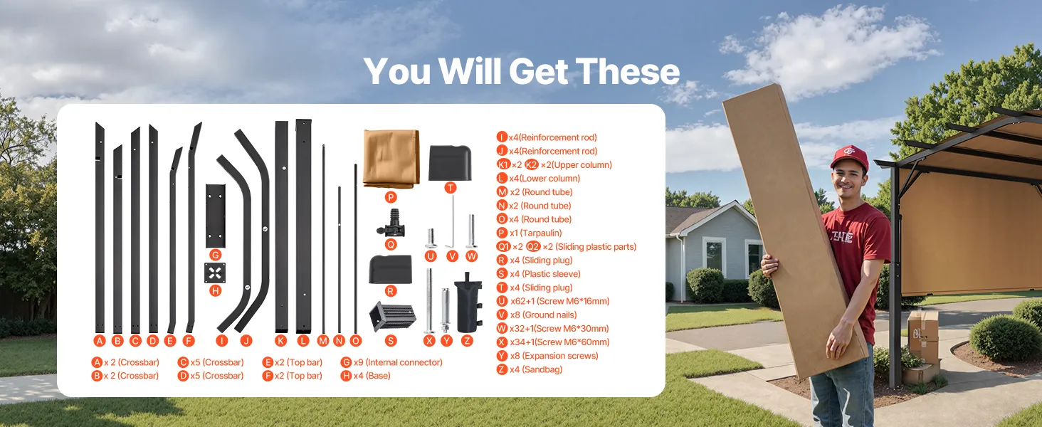 Qué incluye: Recibirá un conjunto completo de accesorios, sin necesidad de realizar compras adicionales. El paquete incluye el toldo, el marco, los herrajes de instalación y un manual de instalación detallado para guiarlo a través de una instalación rápida y sencilla