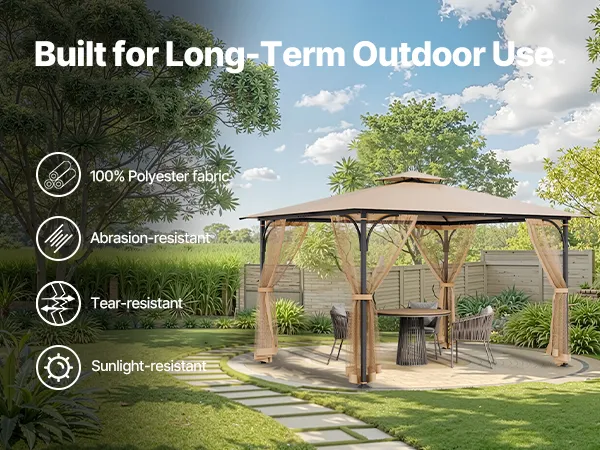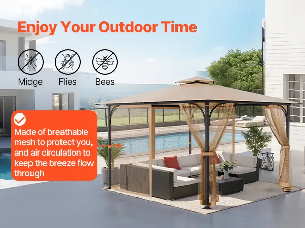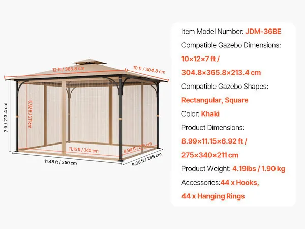 VEVOR Red de Poliéster para Cenadores, Cortina de Malla para Cenadores con Paredes Laterales de 4 Paneles, Red Antimosquitos con Doble Cremallera, para Cenadores de 304,8 x 365,8 x 213,4 cm, Caqui