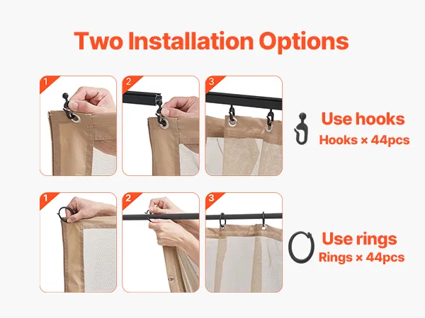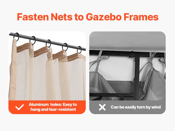 Diseño cuidadoso: Cada lado cuenta con cremalleras de doble cara para facilitar el acceso. Los bordes de la red de malla para patio están equipados con correas de sujeción en la parte superior, media e inferior, con ojales de aluminio para colgarla fácilmente y resistir el desgarro. Ofrecemos ganchos de plástico y anillos para colgar como opciones de montaje, lo que le permite elegir el mejor método para asegurar la red a su cenador