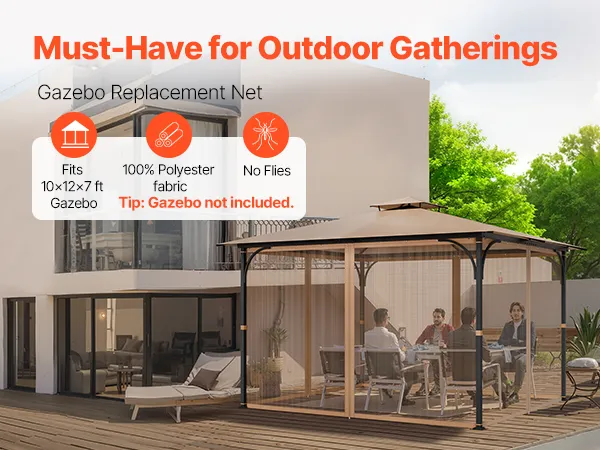 Esta red de repuesto para cenador, hecha a medida para su cenador de 10 x 12 x 7 pies, está hecha de 100 % poliéster. Es suave, liviana y resistente a los desgarros, y mantiene alejados a los mosquitos de manera eficaz. Es ideal para barbacoas en el patio trasero o fiestas en el jardín, ya que garantiza una experiencia cómoda al aire libre.