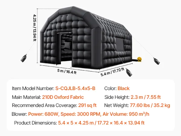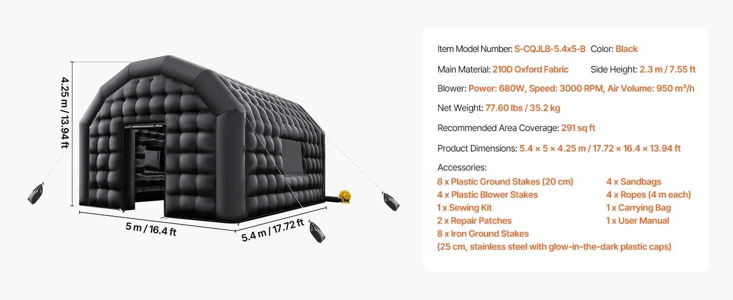 VEVOR Tienda Inflable para Fiestas, Carpa Inflable 5,4 x 5 x 4,25 m con Soplador de 680 W, Saco de Arena y 2 Ventanas, Tienda de Campaña Tipo Cubo para Eventos, Cumpleaños, Bodas y Fiestas, Negro