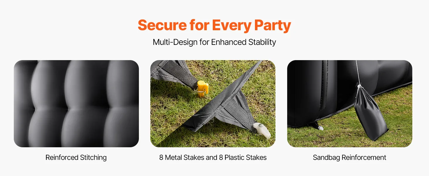 Instalación estable: La carpa inflable para fiestas con costuras reforzadas, múltiples puntos de estacas y bolsas de arena con peso mantienen la carpa segura en cualquier superficie al aire libre