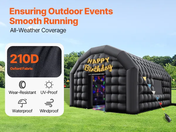 Materiales duraderos: Hecho de tela Oxford 210D resistente al agua y al viento, este club nocturno inflable para fiestas resiste la lluvia ligera y el viento para que los eventos se desarrollen sin problemas