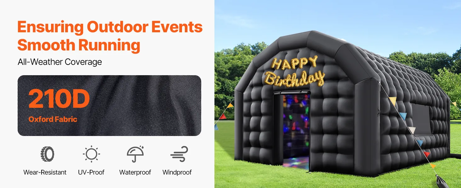Fabricada con tela Oxford 210D, esta carpa inflable para fiestas resiste el sol, la lluvia y el desgaste, ofreciendo una protección confiable para cada celebración al aire libre.