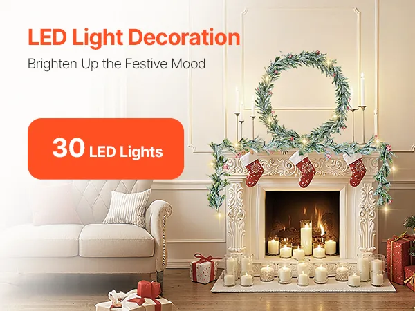 Incluye luces LED: Equipada con 30 luces LED de color blanco cálido, esta guirnalda de Navidad brilla suavemente por la noche, creando un ambiente acogedor y festivo para tu espacio navideño. Funciona con 3 pilas AA (NO INCLUIDAS)