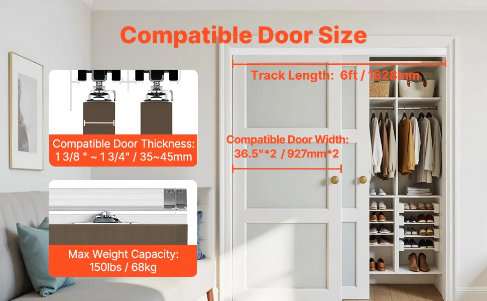 Puerta aplicable: Este kit de herrajes para puertas corredizas de 6 pies se adapta a paneles de puertas con un grosor de 1 3/8" a 1 3/4" y un ancho de 36,5" x 2. Soporta un peso máximo de 150 libras, lo que le permite elegir el tamaño correcto según sus necesidades