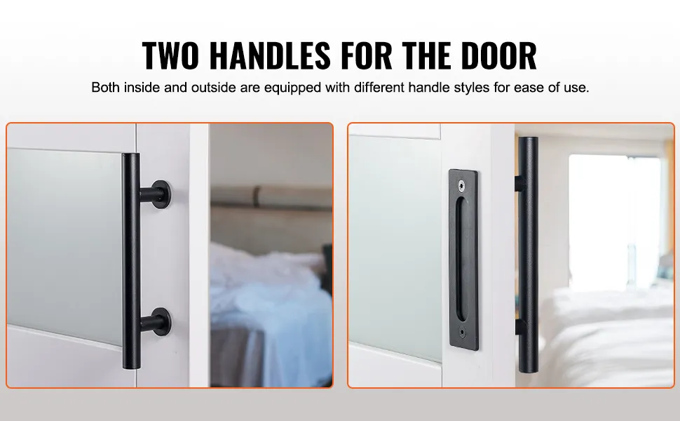 La puerta corrediza tipo granero incluye una manija de doble cara. Esto significa que tiene una manija para tirar y otra para tirar. Puede elegir qué manija usar según sus necesidades. Agrega comodidad al funcionamiento de la puerta. Las manijas son fáciles de instalar y usar. Mejoran la funcionalidad general de la puerta corrediza tipo granero. Estas manijas tienen propiedades fuertes y confiables. Por lo tanto, garantizan un funcionamiento suave y sin esfuerzo en todo momento. La manija de doble cara hace que la puerta corrediza tipo granero VEVOR con guía de piso sea fácil de usar. Disfrute de la facilidad de uso y la mayor comodidad.