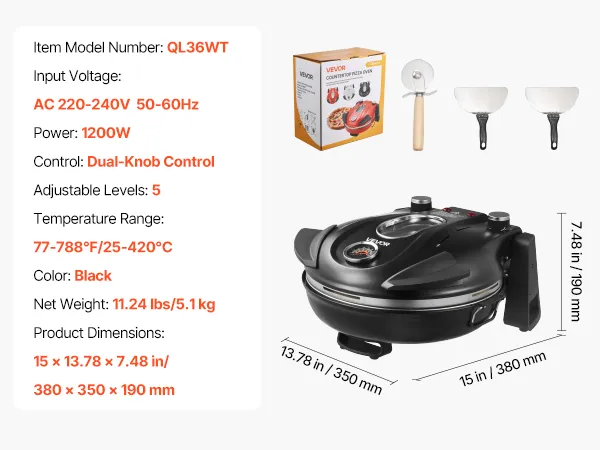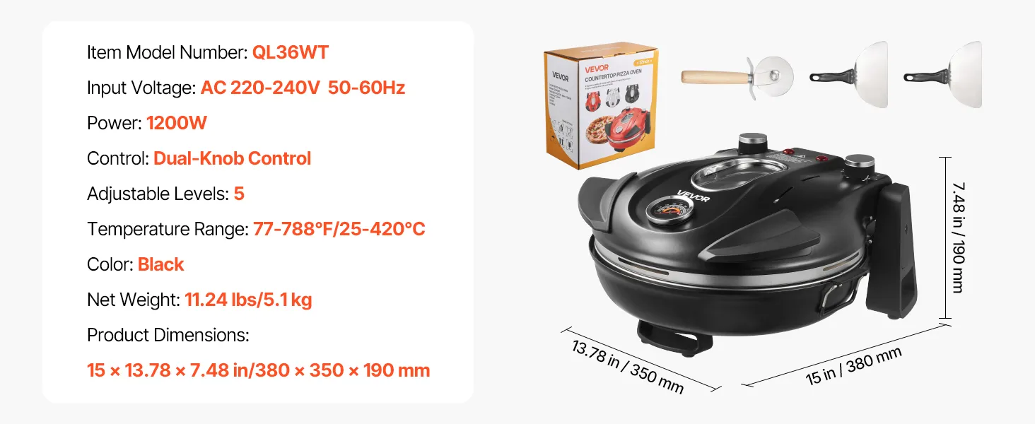 VEVOR Horno de Pizza Eléctrico de 1200 W, con Piedra de Cordierita, Control de Temperatura 5 Niveles, Ventana de Visualización para Una Cocción Precisa, hasta 420 °C, Negro, 380 x 350 x 190 mm