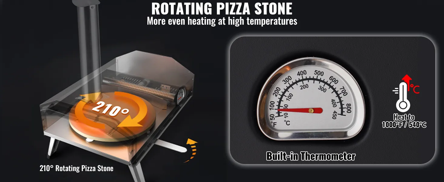 Efficient baking: Bake in just 90 seconds with a 15-minute preheating time and reach temperatures up to 1000°F / 540°C. Ideal for baking 12-inch pizzas and cooking various meats, fish, and vegetables.