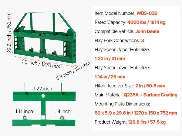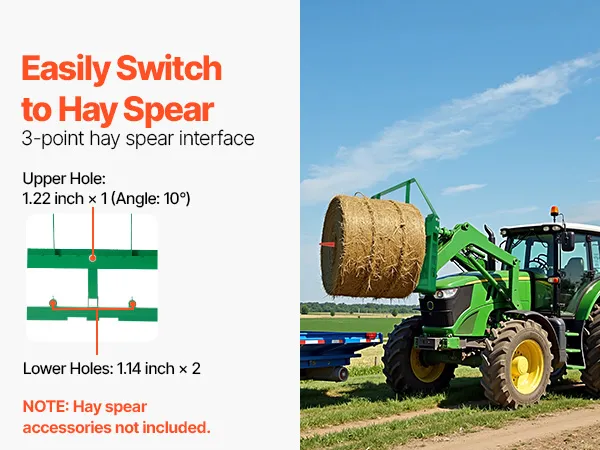 Conviértete en una empacadora de heno: Con tres conectores para pacas de heno (orificio superior de 31 mm, orificio inferior de 29 mm), este accesorio para bastidor de horquillas para palés facilita el transporte de pacas de heno. (Las lanzas de heno se venden por separado). Ahorra tiempo y energía y termina el trabajo rápidamente