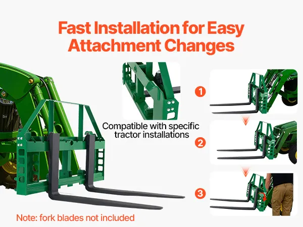 Instalación rápida y sencilla: Este bastidor de paletas, especialmente diseñado para tractores John Deere, se instala fácilmente y sin herramientas. Simplemente deslícelo sobre el tractor, bloquéelo y estará listo para trabajar eficientemente con el mínimo esfuerzo