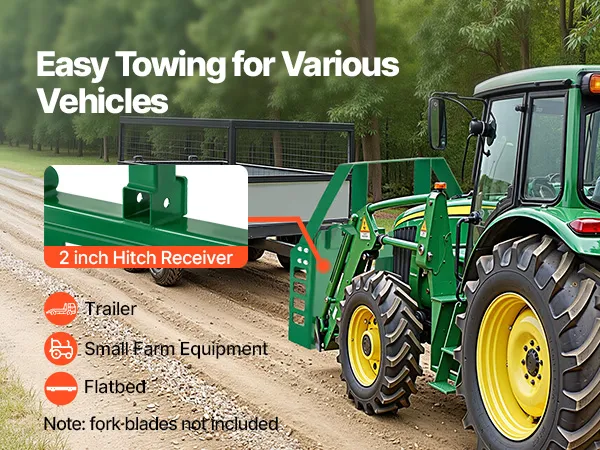 Remolque fácil: Equipado con un enganche de remolque de 50,8 mm, este bastidor de horquillas para paletas de dirección deslizante permite una fácil conexión a enganches de remolque de 50,8 mm para remolcar remolques, camiones de plataforma y más. Ideal para ampliar la capacidad de su cargadora o tractor. (El enganche de remolque se vende por separado)