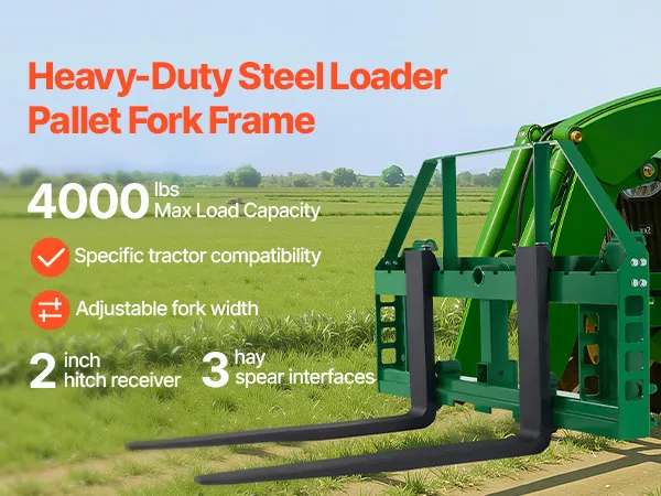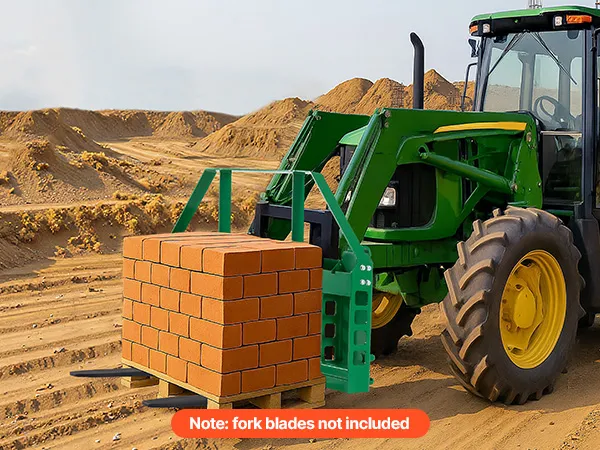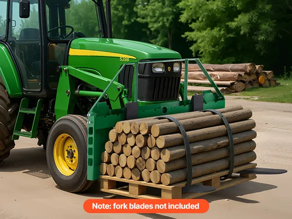 Este bastidor de horquillas para palés, con una capacidad de carga de 1814 kg, está diseñado para la serie de tractores John Deere. Ideal para transportar pacas de heno, materiales de construcción y otros materiales en granjas, jardines o obras. Eficiente y fiable para tareas pesadas.