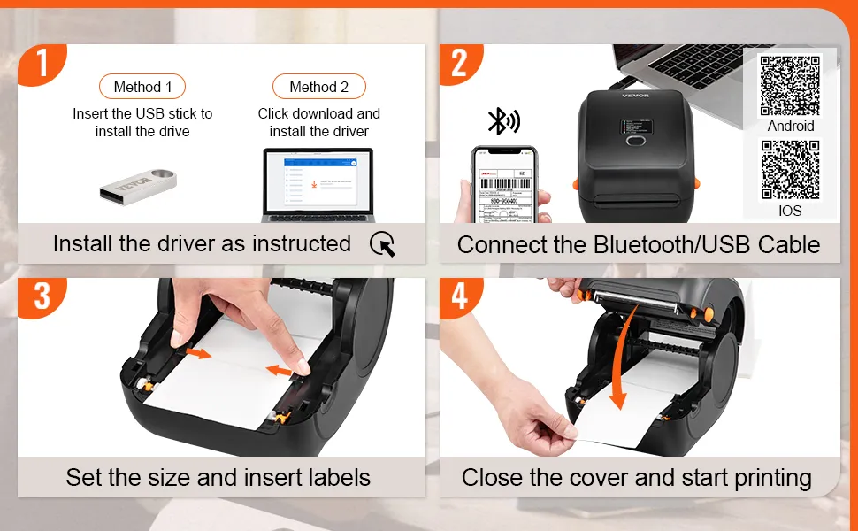 Conexión Bluetooth Inalámbrica: ¡Deshágase de esos cables y comienza a experimentar Bluetooth! Compare con otras impresoras de etiquetas impresas a través de USB, las impresoras térmicas de VEVOR se pueden conectar por Bluetooth o USB. Esta impresora de etiquetas es compatible con iOS, Android, Windows, Mac OS y Linux. Nota: no para Chromebook; Descargue el controlador como se indica antes de imprimir.