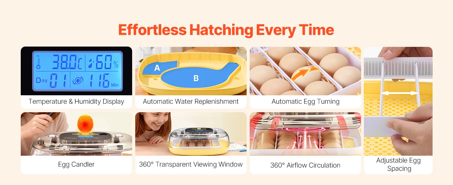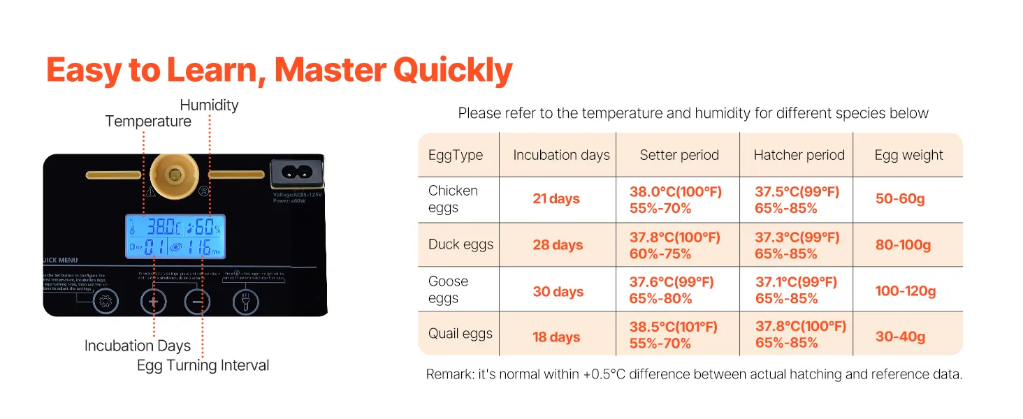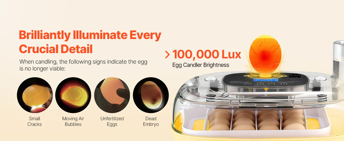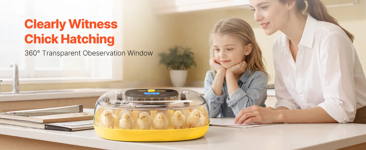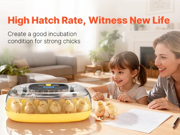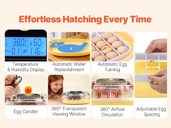 Volteador de huevos y ventana de visualización de 360°: Nuestro volteador automático de huevos incluye un volteador de huevos de alta luminosidad de 10 W Lux para facilitar la inspección de los embriones. La ventana de visualización transparente de 360° permite que toda la familia presencie el nacimiento de los pollitos