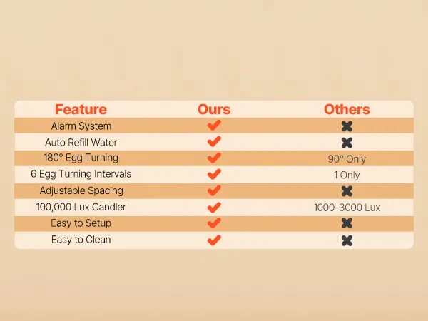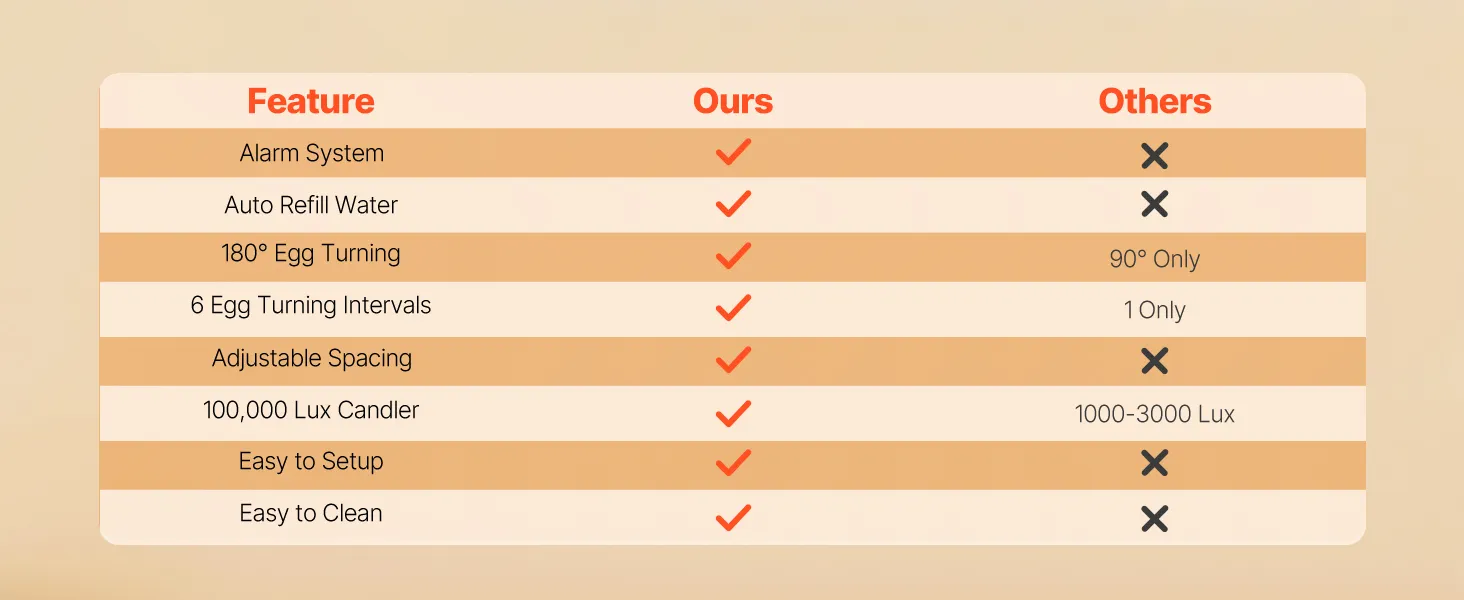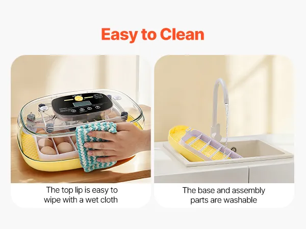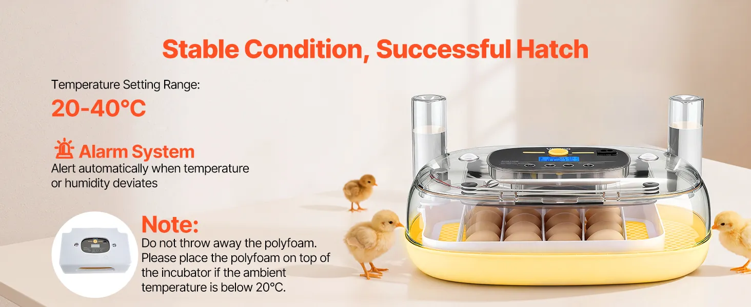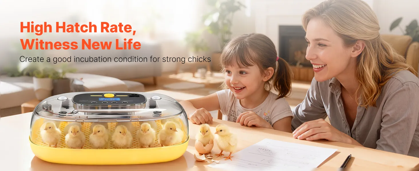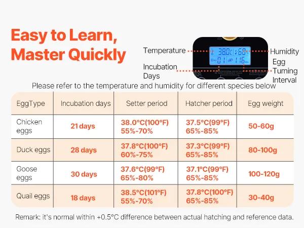 Volteador de huevos y ventana de visualización de 360°: Nuestro volteador automático de huevos incluye un volteador de huevos de alta luminosidad de 10 W Lux para facilitar la inspección de los embriones. La ventana de visualización transparente de 360° permite que toda la familia presencie el nacimiento de los pollitos